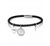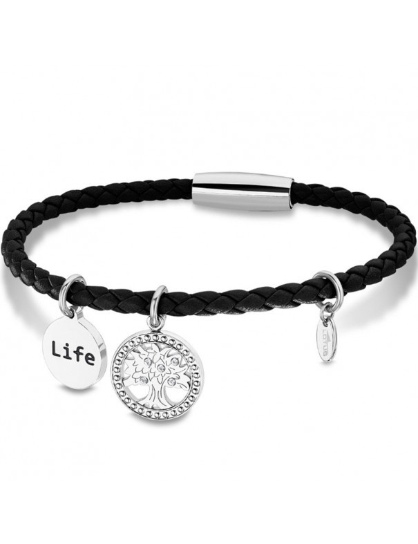 Pulsera Lotus Style Mujer LS2020-2/3. De la colección Urban. Es una pulsera en acero antialérgico e inoxidable con cuero genuino trenzado en color negro y adornado con tres chams: árbol de la vida adornado con circonitas cúbicas transparentes, circulo con grabación "Life" y logo de la marca.