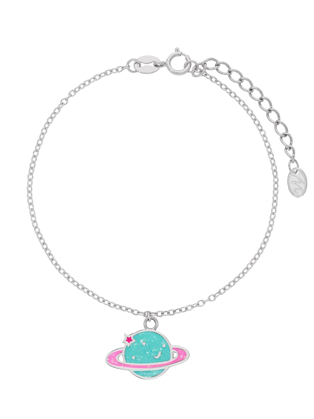 Pulsera planeta. Plata de 1ª Ley rodiada. Esmalte turquesa y rosa. Detalles con purpurina. Cierre rehasa. Cadena adaptable. Colección girls.