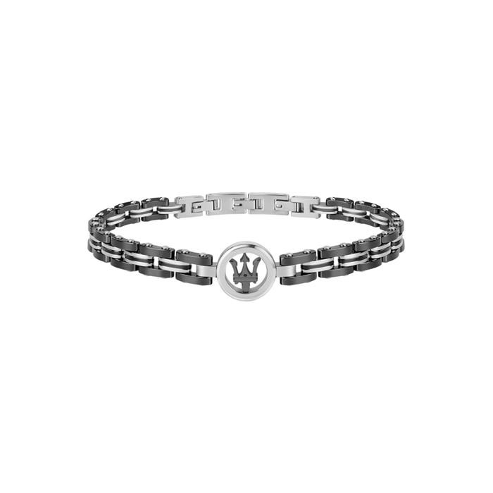 Pulsera Maserati para hombre fabricada en cerámica en colores negro y plateado. Se trata de una pulsera de estilo elegante y rompedor formada por eslabones en colores negro y plateado que dan lugar en su parte central a una pieza circular en cuyo interior encontramos el logotipo de la marca Maserati.