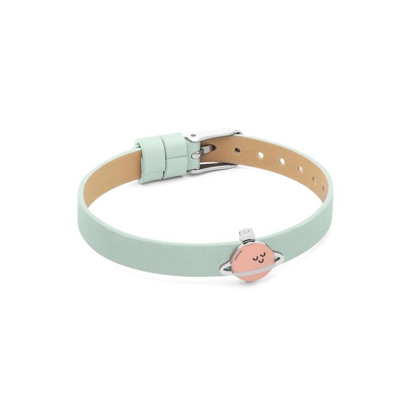 Pulsera Space Vibes de Mr. Wonderful en color verde. Pulsera de piel en color verde que te hará viajar al espacio exterior gracias a su adorno central en forma de planeta sonriente.