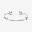 Pulsera Rígida Abierta Lado Oscuro y Lado Luminoso Star Wars™ de Pandora Moments. Uno de los extremos de la pulsera se presenta embellecido con cristales de color azul que recrean el logotipo de la Alianza Rebelde, mientras que el otro extremo se ha embellecido con cristales de color rojo que dan forma al símbolo del Imperio Galáctico. El interior de la pulsera rígida se ha decorado con el icónico sable de luz de Luke Skywalker, mientras que en el exterior se puede leer "MAY THE FORCE BE WITH YOU, ALWAYS" (Que la Fuerza te acompañe siempre).