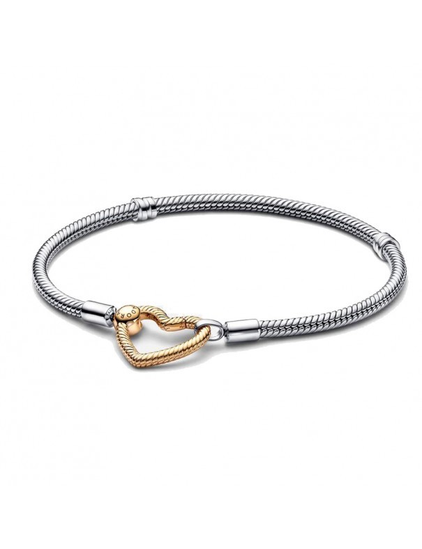 Pulsera Pandora Moments Cierre Corazón 569539C00-17, de plata de primera ley 925mls y cierre de metal con recubrimiento electrolítico de oro de segunda ley de 14kts. Longitud de 17cm.