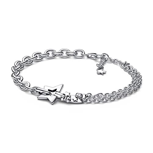 Lleva la magia del cielo nocturno invernal como parte de tu combinación de pulseras. Esta pulsera asimétrica presenta una forma de estrella fugaz central con dos piezas móviles que forman estelas de estrellas, que desembocan en una cadena de eslabones doble, un contraste dinámico con una cadena más grande en el otro lado de la pulsera. Acabado a mano en plata de ley, la estrella fugaz está engastada con relucientes circonitas cúbicas redondas de talla brillante, por lo que puedes brillar como la estrella que eres en esta temporada navideña y más allá.