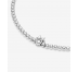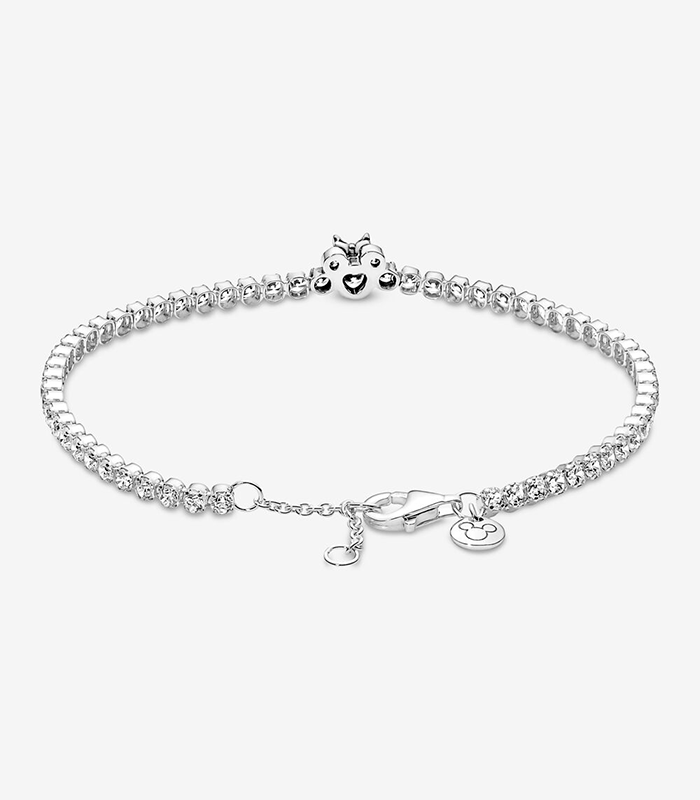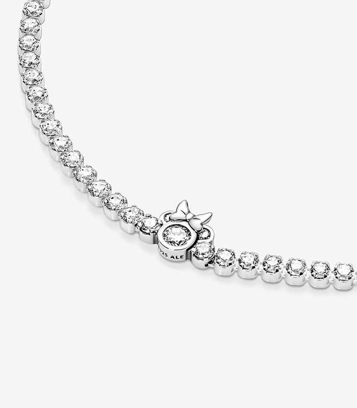 PULSERA PANDORA MINNIE MOUSE CON CIRCONITAS 590107C01. Terminada a mano y elaborada con plata de ley 925, la joya está decorada con circonitas cubicas de talla brillante colocadas a lo largo de toda la pulsera y un elemento central que representa una silueta brillante de Minnie Mouse, de Disney. Con posibilidad de regular el cierre para mayor comodidad.