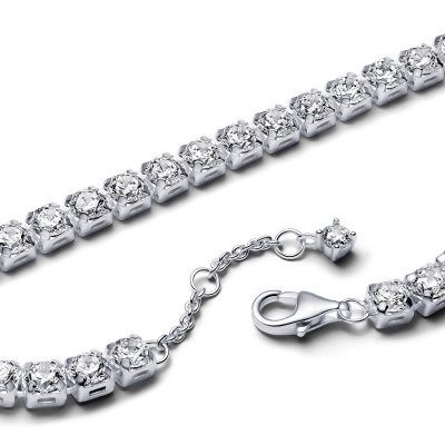 pulsera Pandora Timeless 593539C01-18 Tenis ancha brillante orientada para mujer, es de plata de primera ley 925ML. Embellecido con una fila de 34 brillantes circonitas cúbicas con talla brillante redonda y engastes en garra. Diseñada pensando en combinarla, este es el diseño perfecto para aumentar la escala y profundidad de tus combinaciones gracias al mayor tamaño de sus gemas. Talla: 18 cm.