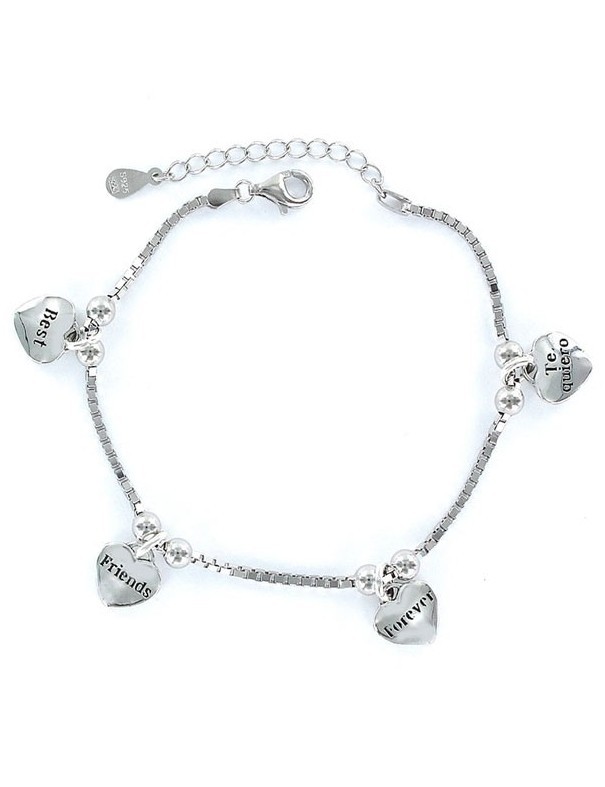 Es una pulsera de cadena veneciana de plata de ley, 925mls, rodiada para mujer, decorada con cuatro colgantes de corazón con inscripciones de amistad. Tiene una longitud máxima de 18 centímetros, reducibles hasta 15 centímetros, gracias a las argollas que ya incorpora la pulsera.
