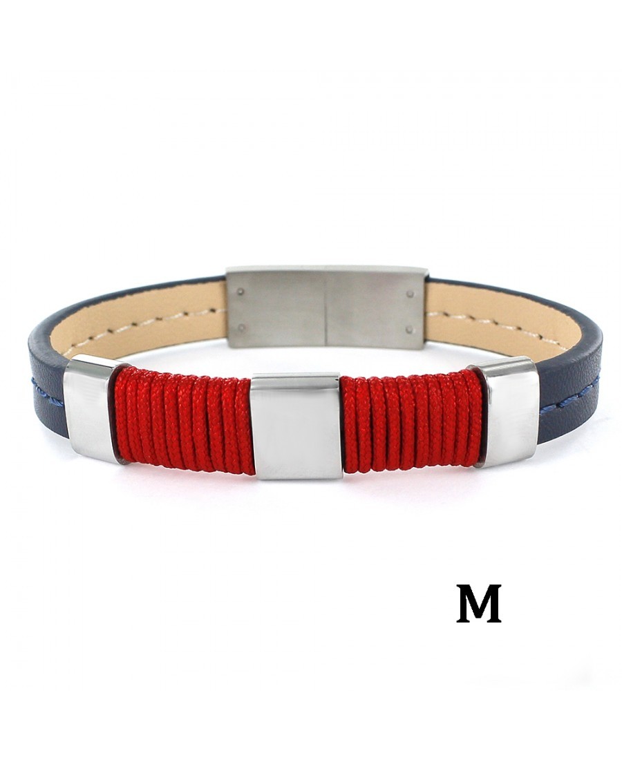 Pulsera de caballero en acero y cuero azul plano en el centro cordón rojo