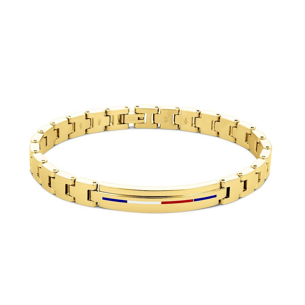 Pulsera de eslabones de acero inoxidable pavonada en oro amarillo de 19cm, con los colores de la marca en el centro
