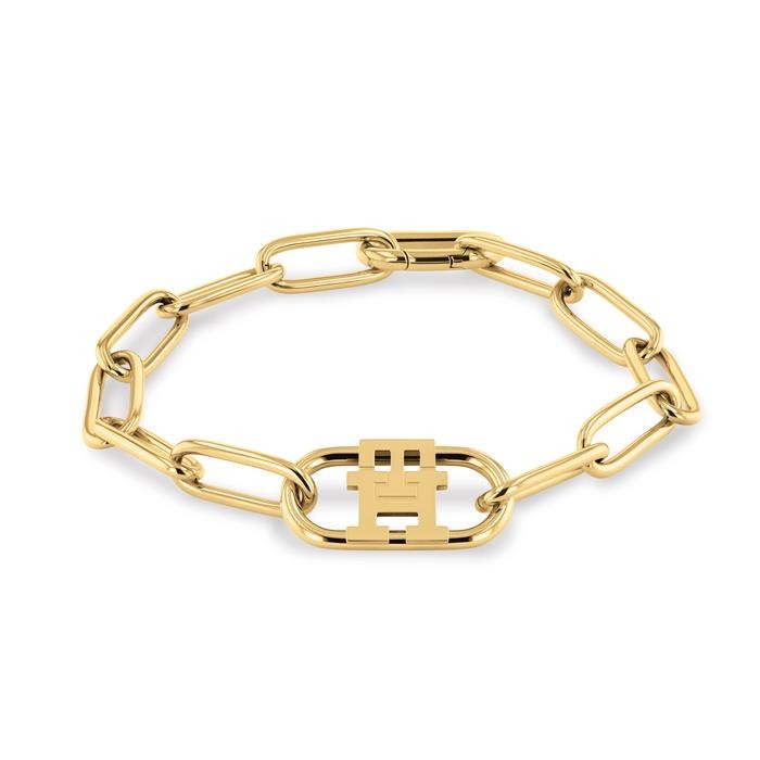 Pulsera Tommy Hilfiger para mujer fabricada en acero inoxidable bañado en oro formada por una cadena compuesta de eslabones ovalados con un abalorio central con el logotipo Tommy Hilfiger. Su cierre es de gancho.