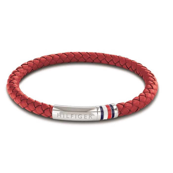 Pulsera Tommy Hilfiger para hombre fabricada en cuero rojo trenzado con cierre en acero inoxidable magnético que posee el grabado del logotipo de la marca y los colores de la bandera.
