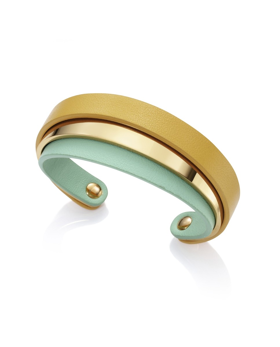 Tipo Pieza: Pulsera Detalle Pieza: Brazalete abierto Material Principal: Acero Otros Materiales: Piel Baño / Chapado: Ip dorado Acabado: Brillo / pulido Largo / Diametro: 58mm Color: Multicolor