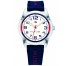Reloj cuarzo 3 agujas, caja de acero, esfera blanca y correa de silicona azul.
