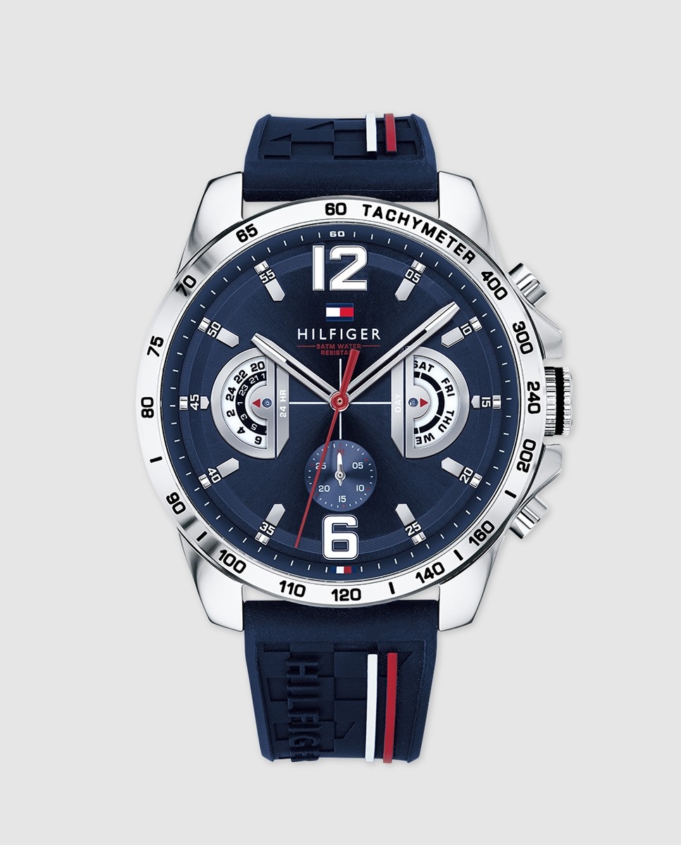 Reloj multifunción, caja redonda de acero, esfera en azul marino y correa de silicona azul con rayas verticales en rojo y blanco y nombre de la marca.
