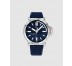 Reloj de acero tres agujas, caja de acero, esfera azul y correa de silicona azul.