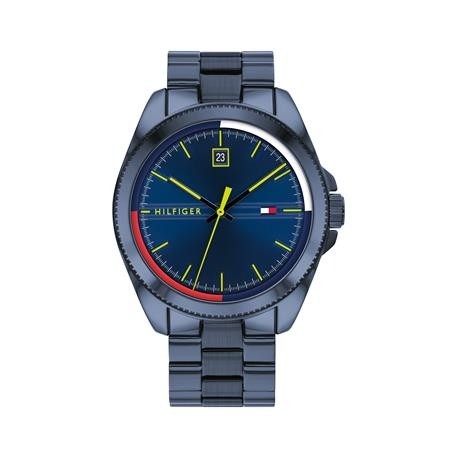Reloj Tommy Hilfiger Rilery para hombre fabricado en acero inoxidable color azul marino. Cuenta con 44 mm de diámetro de caja con esfera en color azul en contraste con agujas y diales amarillos. Posee mecanismo de cuarzo analógico protegido por cristal mineral. Su correa compuesta por eslabones tiene cierre desplegable. Resistencia al agua hasta 5 ATM.