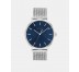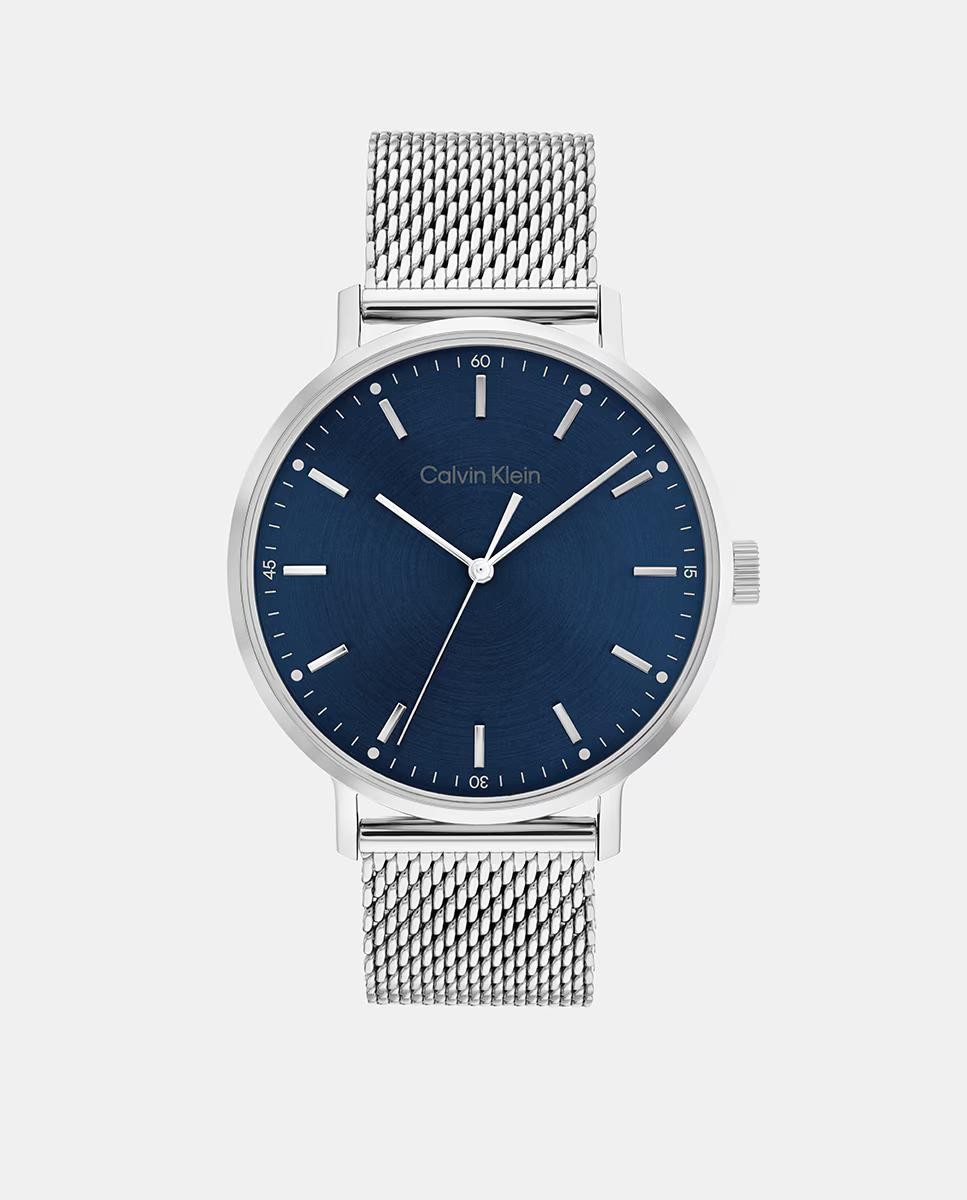 Reloj de 3 agujas con caja de acero inoxidable y esfera azul tornasolada. Brazalete de malla milanesa en acero inoxidable.