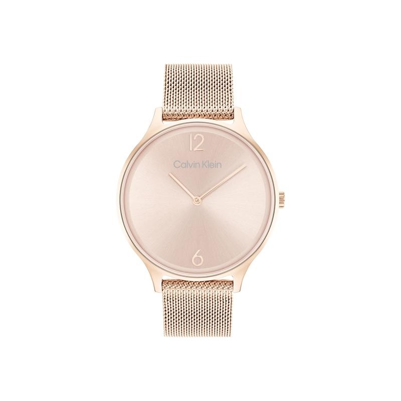 Reloj Calvin Klein para mujer perteneciente a la colección Timeless fabricado en acero inoxidable rosado. Estamos ante un atractivo y original reloj compuesto por caja plateada de 38mm de diámetro con esfera en oro rosa tornasolada con índices y agujas en rosado movidas por mecanismo de cuarzo analógico protegido por cristal mineral. Su correa es de malla milanesa en oro rosa con cierre deslizante. Resistente al agua hasta 30 metros.