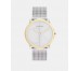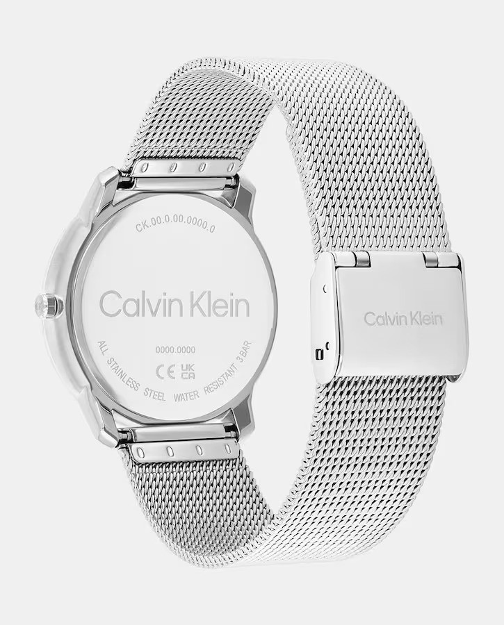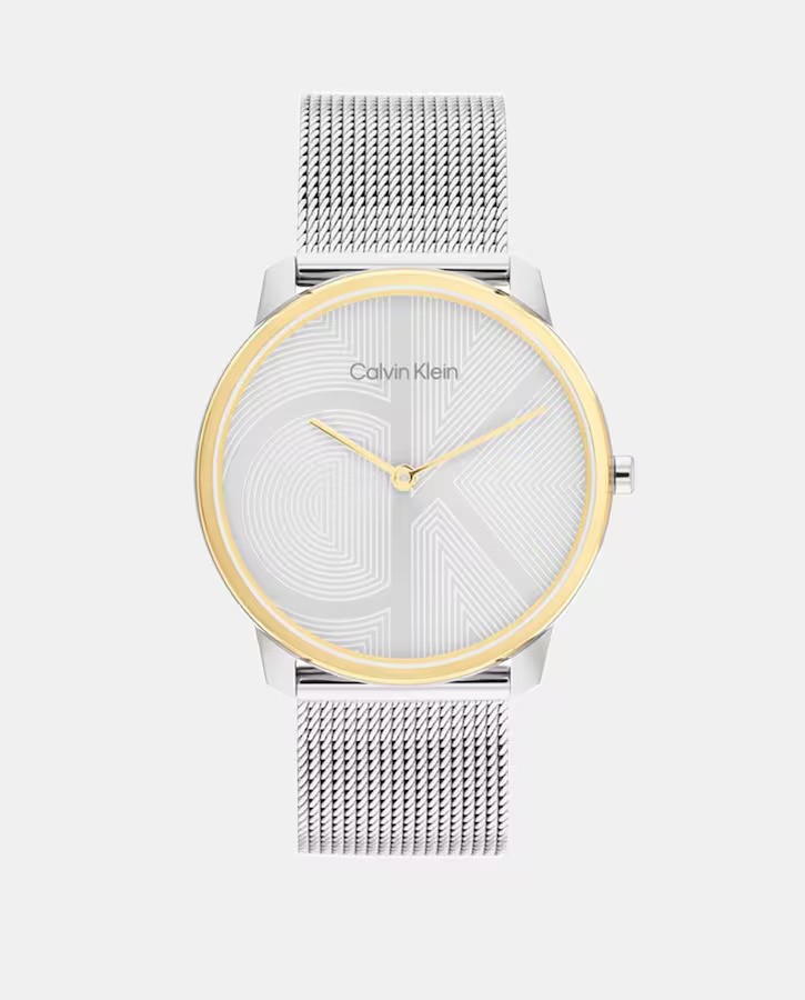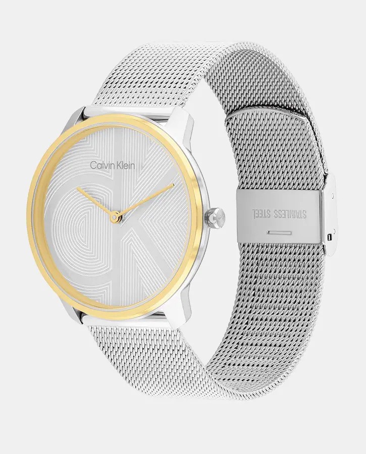 Reloj 2 agujas con caja de acero inoxidable, con esfera plateada con bisel dorado y logo icónico CK. Brazalete de malla milanesa en acero inoxidable. Dimensiones caja 35 mm. Material cristal Mineral Resistencia agua hasta 30 m Tipo de movimiento Cuarzo analógico