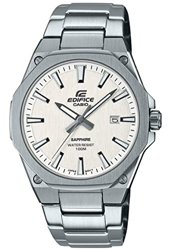 reloj marca Casio Edifice tiene una caja de Inox con un diámetro de 39.9 mm y cuenta con una correa de metal. Dentro de la caja se encuentra un mecanismo de Casio de alta calidad el cual esta protegido por un cristal Zafiro. El reloj es resistente al agua hasta 10 ATM. Esto significa que el reloj es adecuado para nadar.