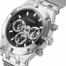 Reloj Guess Hombre GW0582G1 Acero Esterilla. Caja de acero de 44mm. Brazalete de acero malla esterilla. Esfera negra y agujas plateadas. Multifunción. Quartz. Sumergible 50m.