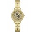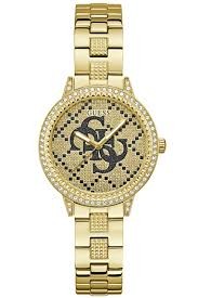 Reloj Guess para mujer fabricado en acero inoxidable dorado. Estamos ante un reloj de diseño elegante compuesto por caja de 34mm de diámetro con bisel compuesto por cristales brillantes y esfera dorada con el logo 4G. Sus agujas son doradas movidas por mecanismo analógico protegido por cristal mineral. Su brazalete lo forman eslabones dorados con cierre desplegable mediante doble pulsador. Resistente al agua hasta 3 ATM.