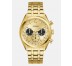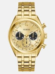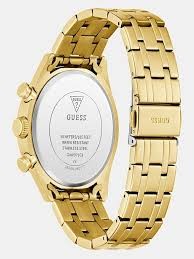 Guess Número de modelo: GW0971G2 Esfera: analógica, color: dorado Caja: caja de acero inoxidable dorada, diámetro aprox. 44 mm (sin corona), altura aprox. 10,8 mm Fondo: acero inoxidable con el logotipo del fabricante Brazalete: brazalete de acero inoxidable dorado, ancho: aprox. 2,2 cm Longitud del reloj: aprox. 21,0 cm Cierre desplegable Resistente al agua: resistente al agua 5 ATM (50 m) Funciones/indicadores: movimiento de cuarzo, cristal mineral endurecido, indicador de horas, minutos y segundos, indicador de fecha, multifunción