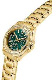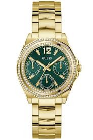 GUESS GW0685L5. Luce un estilo lujoso con este espectacular brazalete multifunción, puro lujo en movimiento. Cuenta con una caja y brazalete redondos de acero reciclado en tono dorado de 36 mm. La esfera verde intenso con efecto rayos de sol ofrece funciones multifunción.