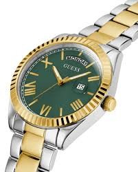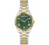 Diseño con caja y brazalete de acero inoxidable bicolor chapado con cierre de seguridad de doble pulsador, fondo a presión, cristal mineral, movimiento de cuarzo, analógico, agujas luminiscentes, calendarío (día-nombre de día), water resist.
