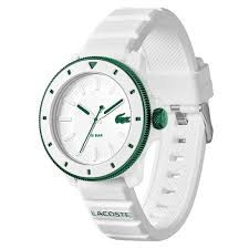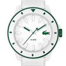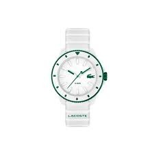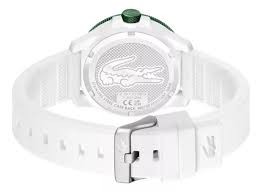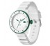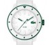Reloj Lacoste de Hombre fabricado con correa de silicona en blanco y el nombre de la marca en color verde. Dispone de bisel y esfera en color blanco, tres agujas en color verde, marcadores en forma de barra y el logotipo de la marca en la posición del 3.