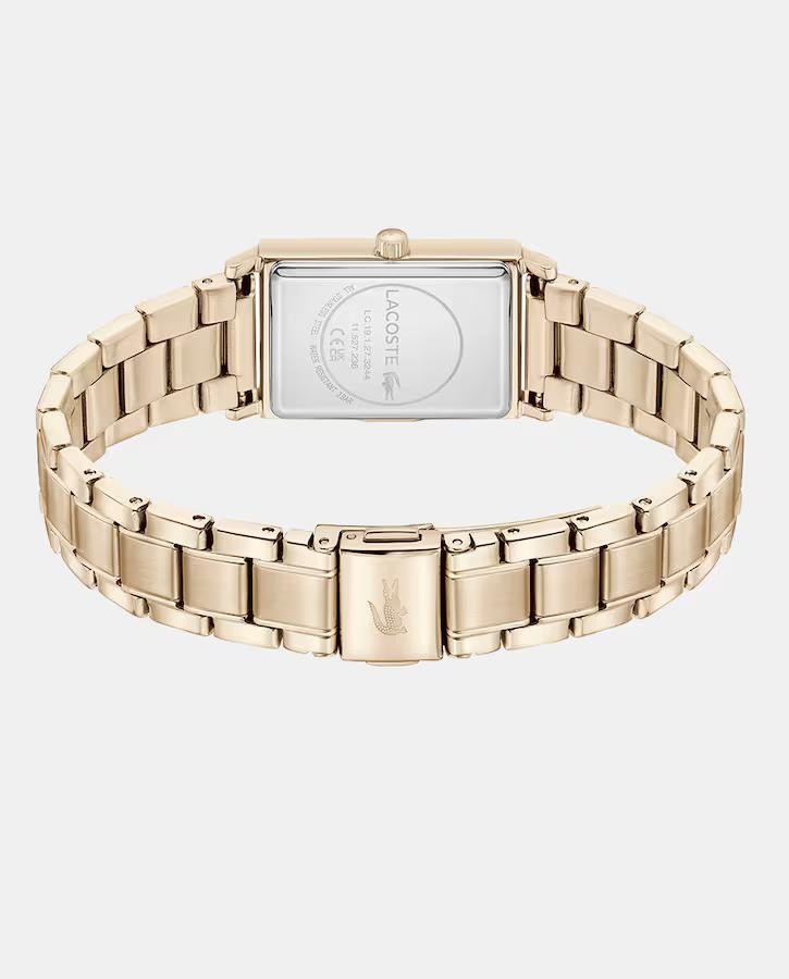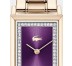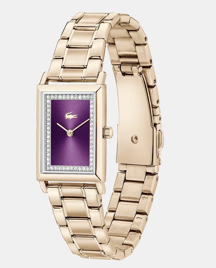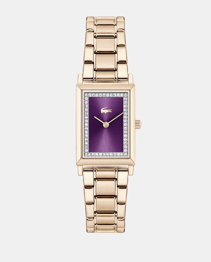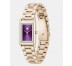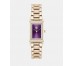 Reloj 3 agujas. Caja de acero inoxidable cuadrada 28,3x20,3mmionizada en oro rosa empolvado. Esfera en tono ciruela sin indicadores con cristales incrustados. Brazalete de eslabones ionizado en oro rosa empolvado.