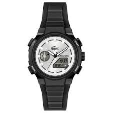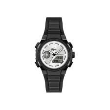 Reloj Lacoste para mujer de la colección LC33 fabricado en TR90 y silicona en color negro. Estamos ante un reloj de diseño atrevido compuesto por caja de 40mm en color negro con esfera plateada que cuenta con indicadores en forma de barras luminiscentes al igual que sus agujas movidas por mecanismo analógico. En su esfera podemos encontrar subesferas de mecanismo digital. Todo ello protegido por cristal mineral. Su correa es de silicona en color negro con cierre de hebilla. Resistente al agua hasta 10 ATM.