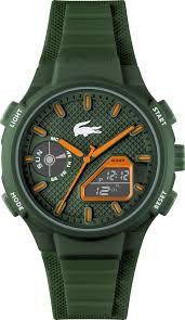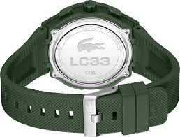 Reloj Lacoste para hombre de la colección LC33 fabricado en TR90 y silicona en color verde. Estamos ante un reloj de diseño atrevido compuesto por caja de 45mm en color verde al igual que su esfera con indicadores en forma de barras en color naranja como sus agujas movidas por mecanismo analógico. En su esfera podemos encontrar subesferas de mecanismo digital. Todo ello protegido por cristal mineral. Su correa es de silicona en color verde con cierre de hebilla. Resistente al agua hasta 10 ATM.