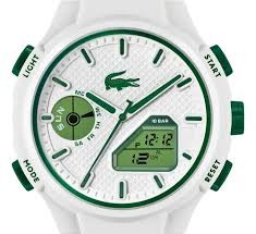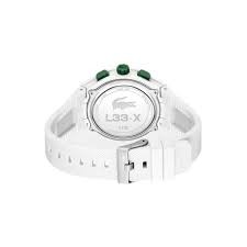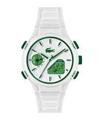 Reloj Lacoste para hombre de la colección LC33 fabricado en TR90 y silicona en color blanco. Este reloj de diseño atrevido está compuesto por caja y esfera de color blanco con indicadores en forma de barras en color verdes como sus agujas movidas por mecanismo analógico. En su esfera podemos encontrar subesferas de mecanismo digital. Su correa es de silicona en color blanco con cierre de hebilla.