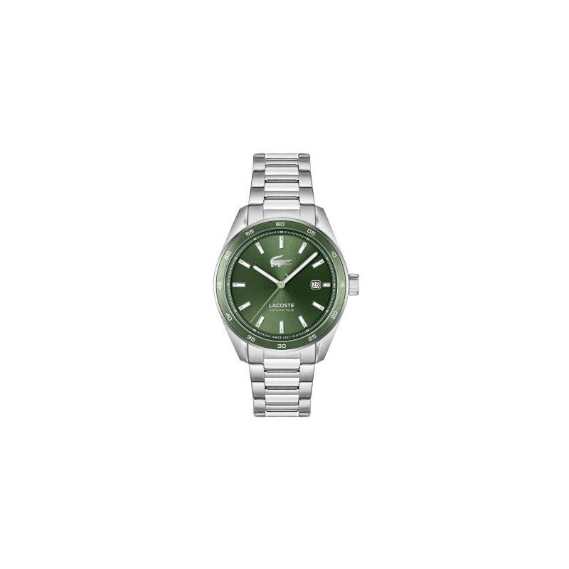 Reloj Lacoste para hombre de la colección Boston fabricado en acero inoxidable plateado y verde. Estamos ante un elegante reloj cmpeusto por caja plateada de 41mm de diámetro con bisel de aluminio verde al igual que su esfera que contiene indicadores en forma de barra luminiscentes al igual que sus agujas movidas por mecanismo automático con función de calendario. Todo ello protegido por cristal mineral. Su correa está formada por eslabones plateados con cierre desplegable mediante doble pulsador. Resistente al agua hasta 5 ATM.