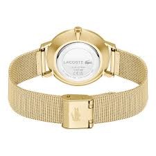 Fabricado con una caja de acero inoxidable dorado de 35 mm y un brazalete tipo mesh a juego, este reloj análogo combina materiales de alta calidad con un diseño armónico. La carátula exhibe aplicaciones tipo cristal en los marcadores principales y el emblema clásico de Lacoste, complementado por un mecanismo de cuarzo confiable y cristal mineral resistente. El extensible con broche desplegable brinda seguridad y comodidad durante todo el día. Con hermeticidad de 3 ATM