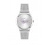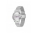 Correa en acero de malla milanesa con acabado plata y esfera con logo en piedras.