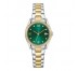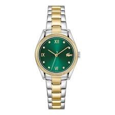 Reloj Lacoste para mujer de la colección Parisienne fabricado en acero inoxidable plateado y dorado. Estamos ante un elegante reloj compuesto por caja de 30mm de diámetro con bisel dorado que cuenta con esfera verde con indicadores dorados con cristales brillantes. Sus agujas son doradas movidas por mecanismo de cuarzo analógico. Todo ello protegido por cristal mineral. Su brazalete lo forman eslabones plateados y dorados con cierre desplegable mediante doble pulsador. Resistente al agua hasta 5 ATM.