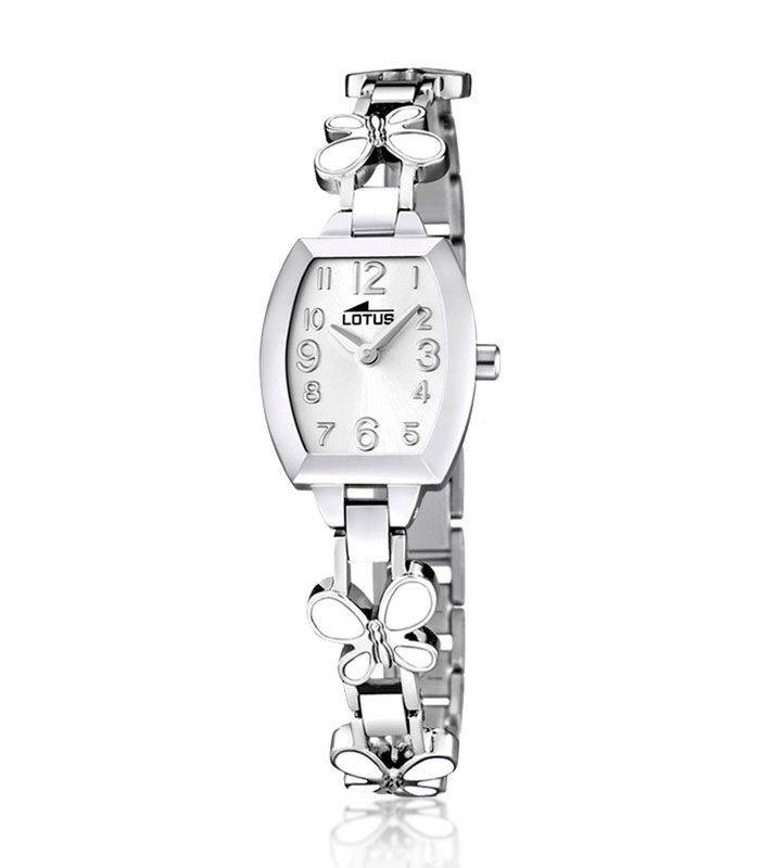 Reloj Lotus de Niña analógico. Esfera blanca. Cristal mineral. Movimiento de cuarzo. Caja de acero inoxidable. Brazalete de acero con mariposas esmaltadas. Cierre de seguridad. Diámetro de caja 24 x 30 milímetros Aprox. W.R. 50 bar.