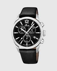 Reloj Lotus para hombre de la colección Chrono fabricado en piel color negro y acero inoxidable plateado. Se trata de un reloj de diseño elegante lleno de atractivo con caja plateada de de 42mm de diámetro que contiene esfera negra con índices y agujas plateadas movidas por mecanismo de cuarzo analógico con función de cronógrafo y calendario, todo ello protegido por cristal mineral. Su correa es de piel color negro con cierre de hebilla. Resistente al agua hasta 100 metros.
