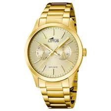 Reloj Lotus para hombre de la colección Minimalist fabricado en acero inoxidable dorado. Estamos ante un atractivo reloj de diseño elegante compuesto por caja de 42mm de diámetro con esfera color champán con indicadores y agujas en dorado movidas por mecanismo de cuarzo analógico Multifunción. Todo ello protegido por cristal mineral. Su correa está formada por eslabones dorados con cierre desplegable mediante doble pulsador. Resistente al agua hasta 5 ATM.