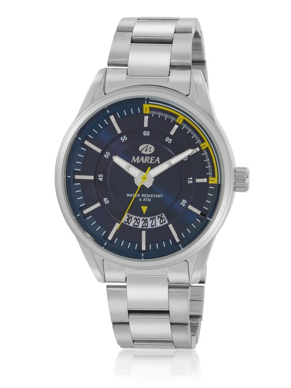 Reloj Marea Hombre B54205/2 Acero. Caja de metal. Brazalete de acero. Esfera azul con detalles en amarillo. Calendario. Sumergible 50m.