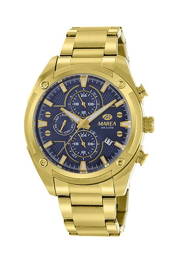 Reloj Marea para hombre modelo B54155/5 fabricada la caja en metal IP dorado, correa de acero IP dorada, multifunción con calendario, cristal mineral y sumergible 5 atmósferas.