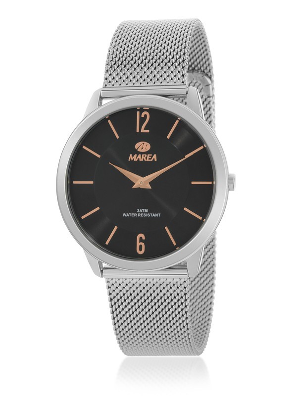 Reloj Marea Hombre B36179/2 Acero Esterilla. Caja de acero de 40mm de diàmetro. Brazalete de acero malla esterilla. Esfera negra con agujas e índices color cobre. Sumergible 30m.