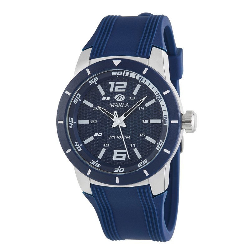 Reloj Marea Hombre Sport B35292/4.El bisel es de color azul que contiene serigrafiado la cuenta exacta de 5 minuto en intervalos en color blanco. La caja que contiene el mecanismo está fabricada en poliuterano de color plateado, mide 42 milímetros de diámetro y tiene una resistencia de 100 metros de profundidad 10 ATM. Correa caucho
