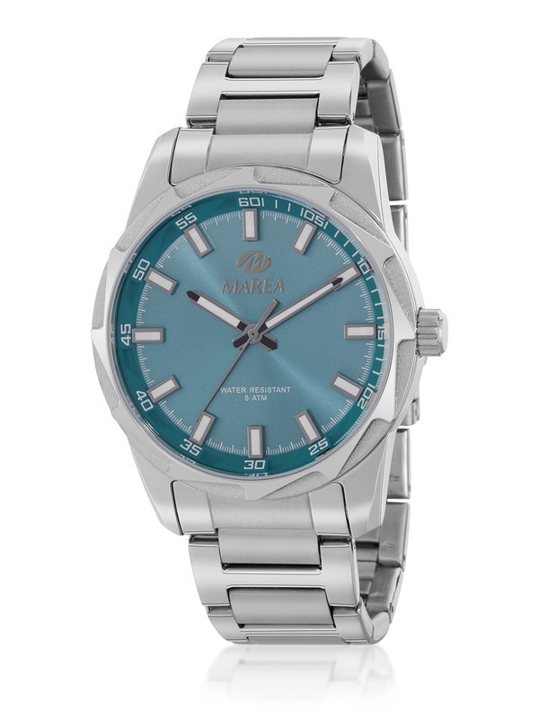 Reloj Marea Hombre B54253/4 Acero. Caja de acero de 42mm. Brazalete de acero. Cierre desplegable. Esfera turquesa. Cristal mineral. Movimiento quartz. Sumergible 50m.