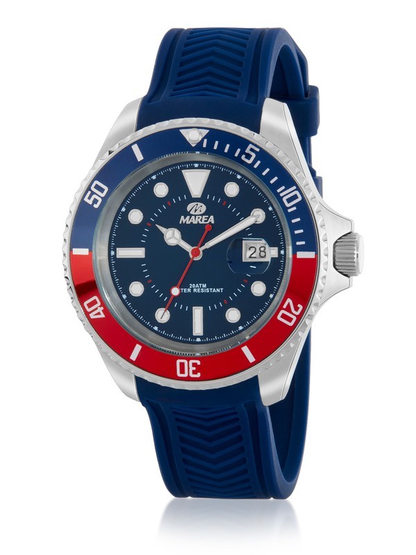 Reloj Marea Hombre B36196/2 Sport Azul . Caja de acero de 43mm. Bisel de acero giratorio azul bicolor rojo. Correa de silicona azul. Cierre hebilla. Esfera azul. Multifunción, calendario. Cristal mineral. Movimiento quartz. Sumergible 200m.