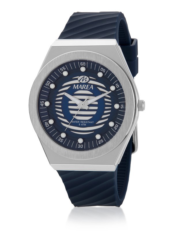 Reloj Marea Hombre B54251/2 Sport Azul. Caja de acero de 44mm. Correa de silicona azul. Cierre hebilla. Esfera azul bicolor blanco. Cristal mineral. Movimiento quartz. Sumergible 50m.