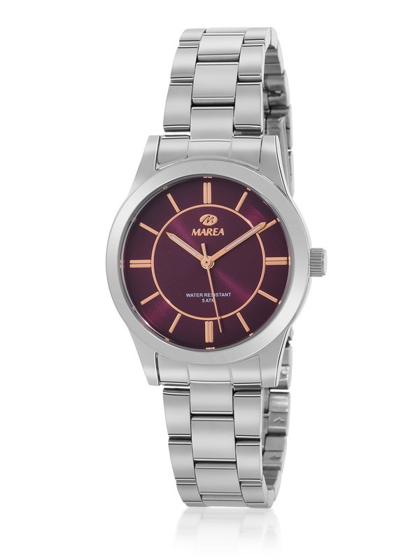 Reloj Marea Mujer B41331/7 Acero. Caja de acero de 32mm. Brazalete de acero. Cierre desplegable. Esfera burdeos. Cristal mineral. Movimiento quartz. Sumergible 50m.