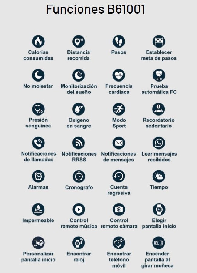 Características extra Envío 24 horas, Alarma, Bluetooth, Calendario, Calorías, Cronógrafo, Cuenta pasos, Encuentra tu teléfono, Indicador de carga, Información de salud, Monitor del sueño, Notificaciones, Recordatorios, SmartWatch, Táctil, Temporizador regresivo