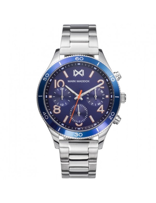 Reloj Mark Maddox hombre multifunción HM7136-34. Es un reloj analógico multifunción diseñado por la firma Mark Maddox, para hombre, y está realizado en metal hipoalergénico e inoxidable, color plata. La caja que guarda el mecanismo tiene un diámetro de 43 milímetros y es sumergible a 50 metros y sobre ella se sitúa el bisel con numeración grabada. La pulsera del reloj tiene un cierre de seguridad de tipo desplegable.